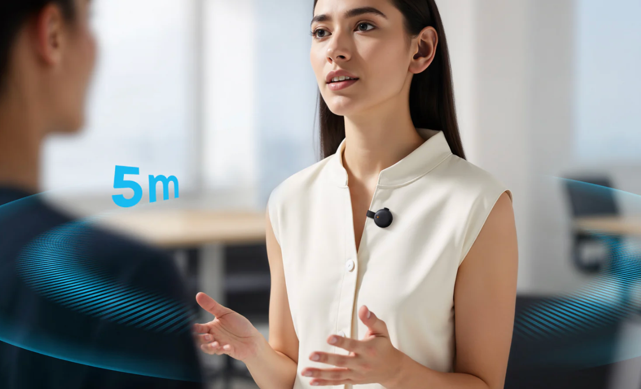 The dual microphones enable precise sound capture within a 5-meter radius, ensuring the speaker's voice is clearly recorded.